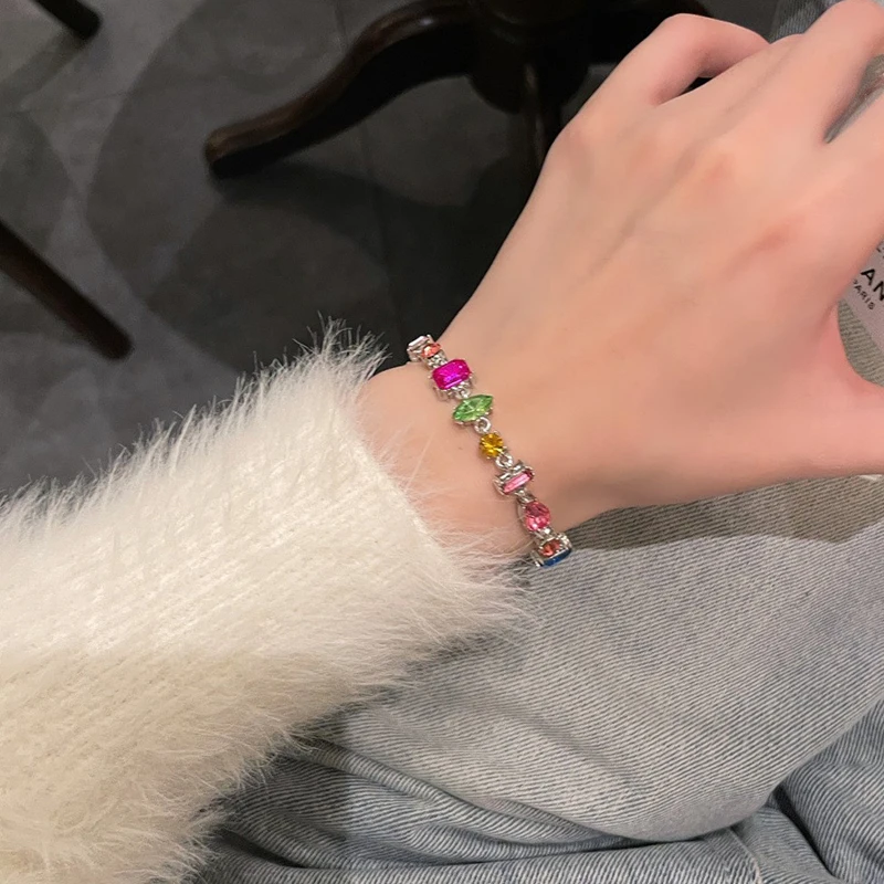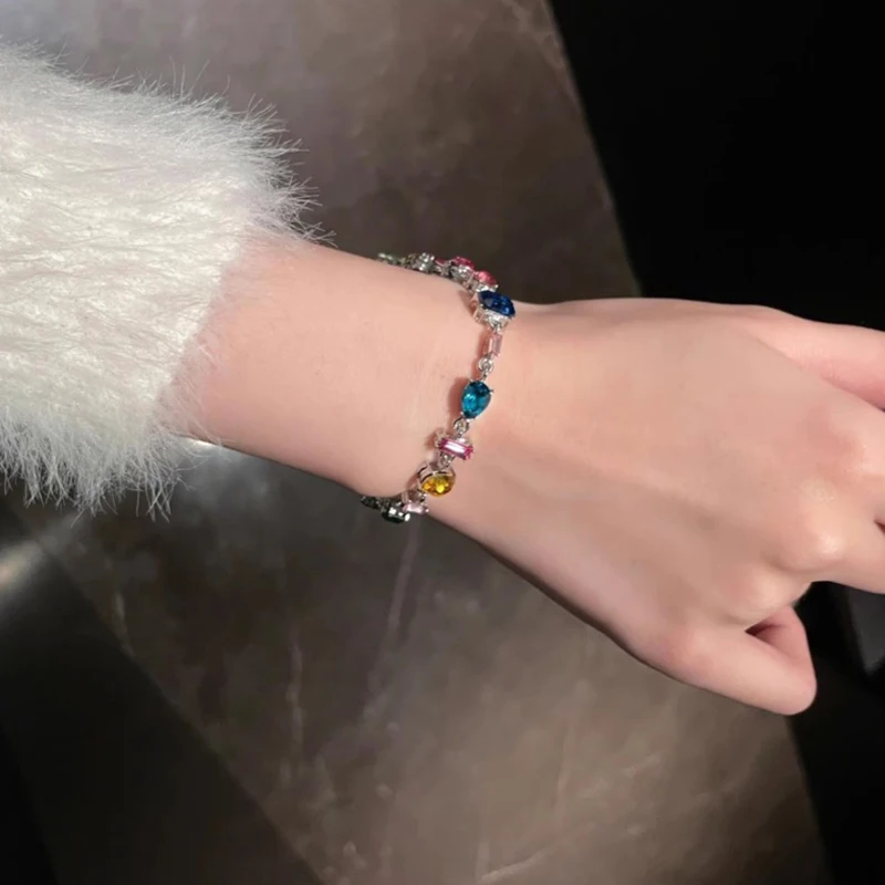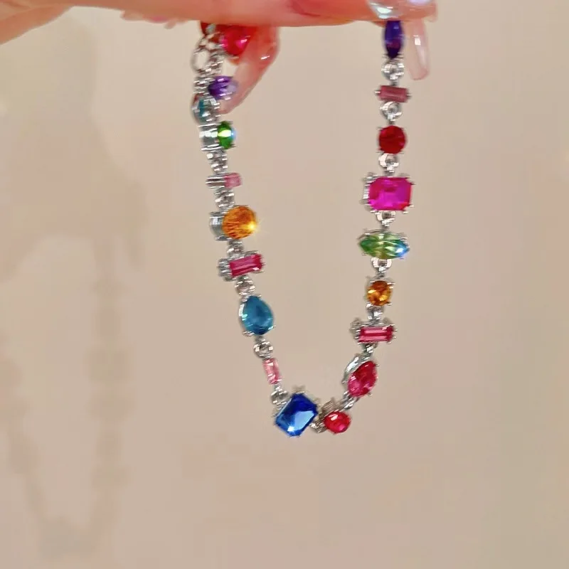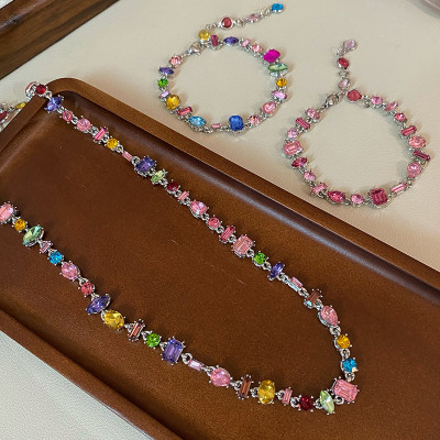 أضيفي لمسة فاخرة وساحرة إلى إطلالتك مع مجموعة مجوهرات الزركون المربع 💖، تشمل سوار وقلادة مزينة بالكريستال وحجر الراين الملون 🌈.