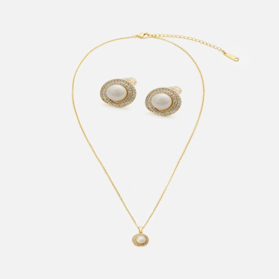 • يتميز الطقم بتصميمه الذي يتزين بحليه بشكل دائري تتزين بفصوص من الزركون اللامع وبخرزة من اللؤلؤ في المنتصف